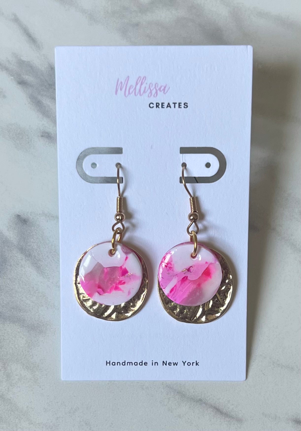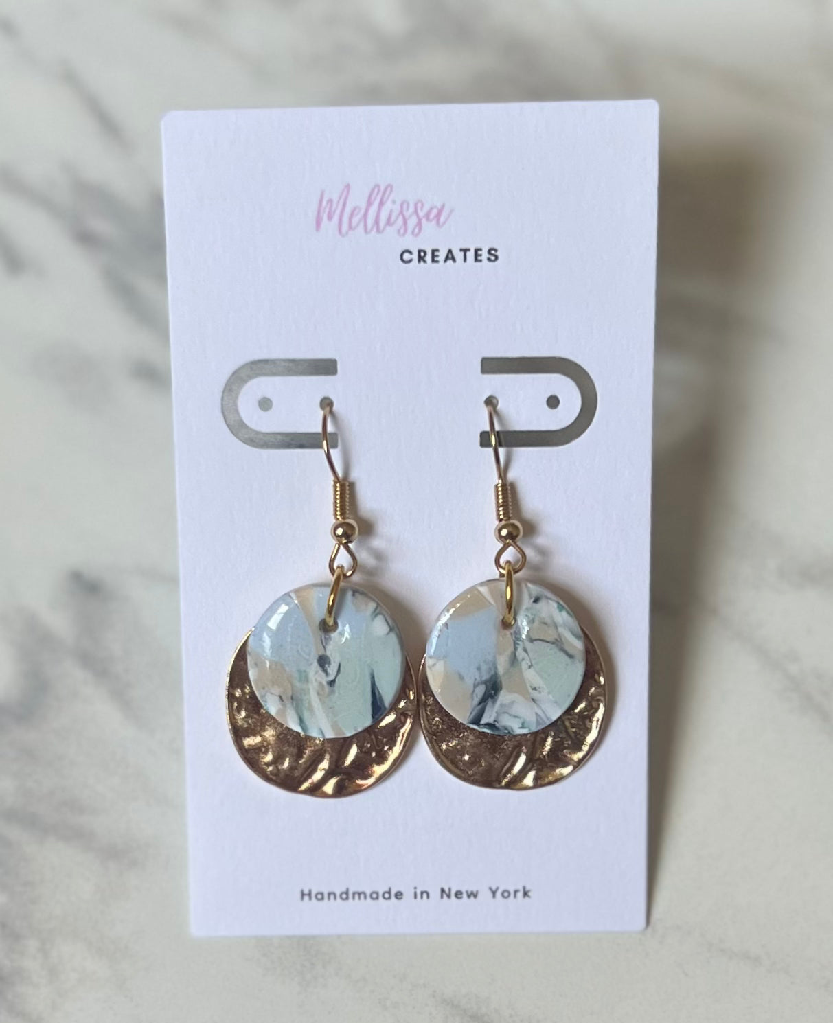 These handmade earrings are made of polymer clay and acrylic paint with a resin overlay. The gold coin is a solid metal piece.