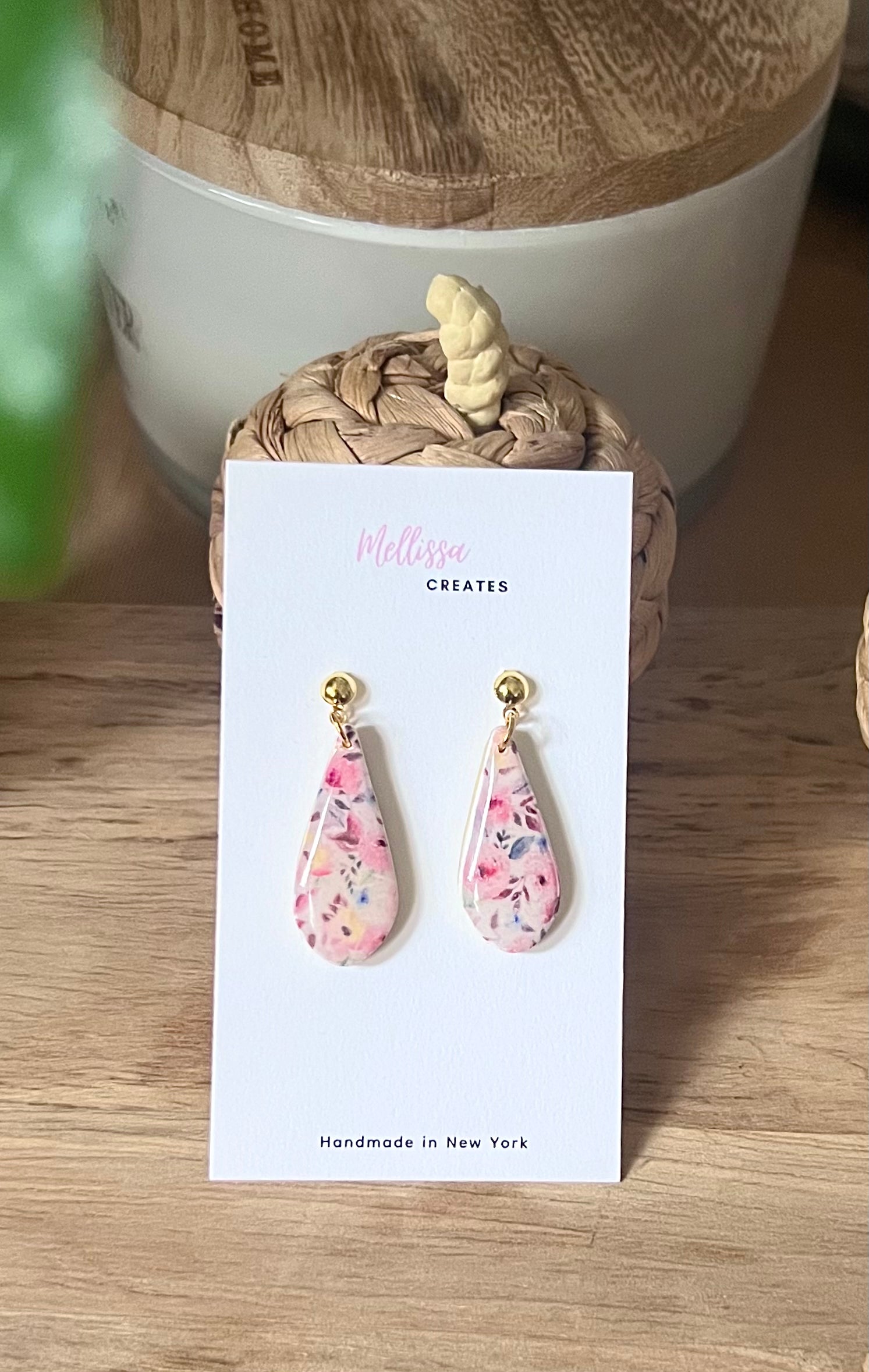 These handmade earrings are made of polymer clay, transfer design with a resin overlay.