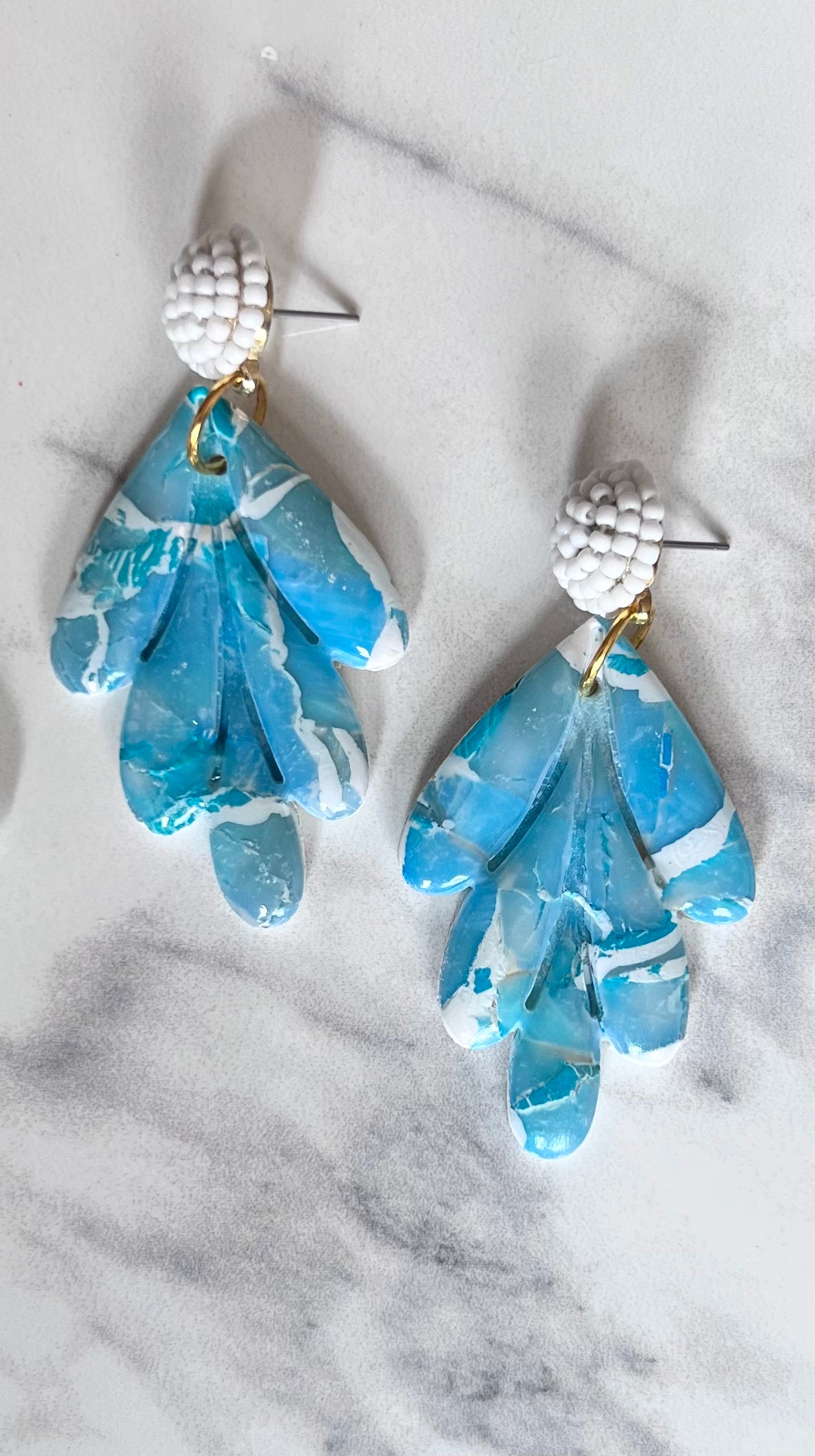 The metal earring is made of metal and covered in white beads. Perfect for vacation!