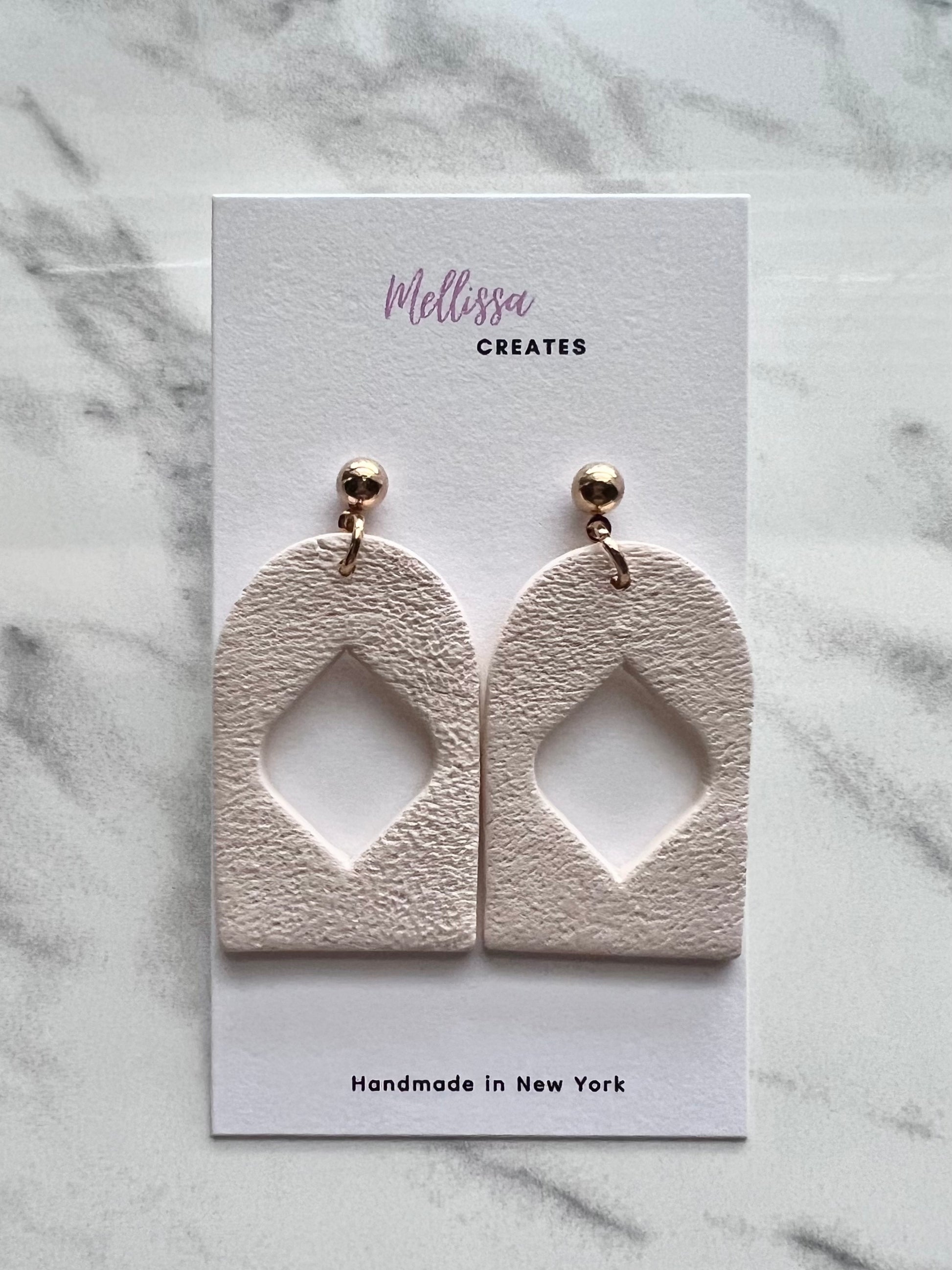 These earrings are made of polymer clay with a creamy color. The textured look is reminiscent of stucco. The style is of an arch with a Diamond shape in the center.
